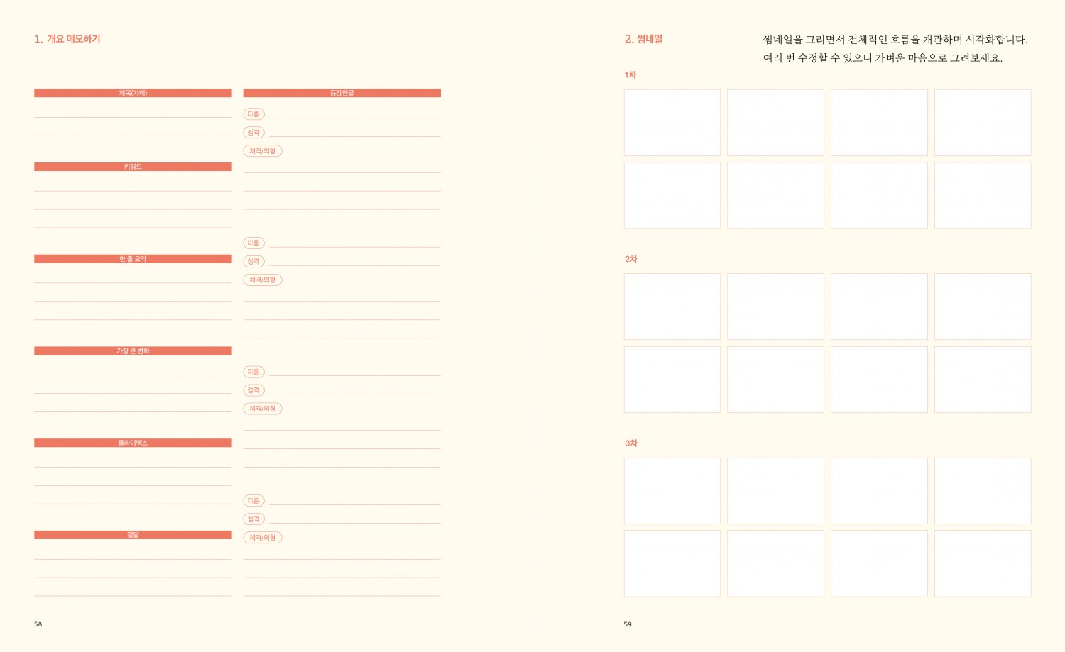 책은 크게 1부와 2부로 나뉜다. 1부는 매체로서 그림책을 이해할 수 있는 기본 지식을 다룬다. 2부는 1부를 바탕으로 실제 더미북을 만드는 단계별 과정으로 이루어진다. 이 같은 구성 아래 총 20개의 챕터가 주간별로 짜여 있어 각 챕터를 한 주에 하나씩 따라가면서 더미북을 완성할 수 있다. 친절한 설명과 함께 그림책의 특성을 이해하고 워크북 페이지의 빈칸을 채워가다보면, 어느새 나만의 그림책 한 권을 만들고 창작자로 첫걸음을 내디딜 수 있다.