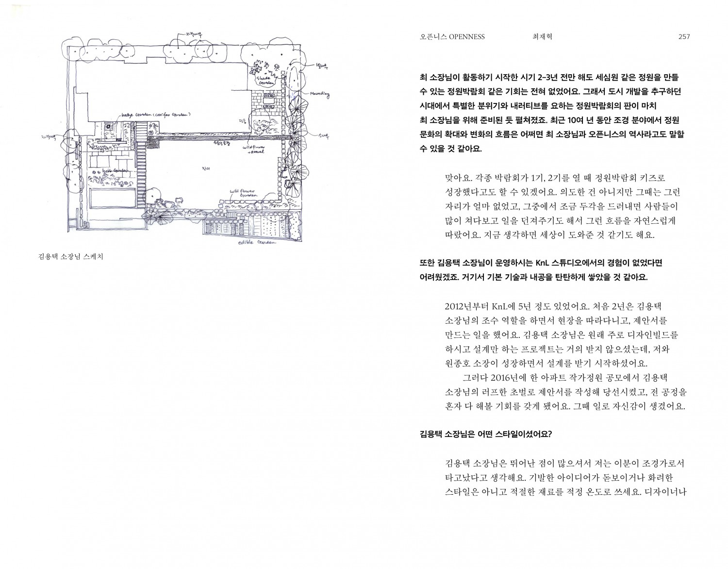 인터뷰한 일곱 팀은 오늘날 한국 조경의 흐름과 방향을 가장 선명하게 보여주는 핵심 주체들이다. ‘얼라이브어스’는 <롯데호텔 제주 특화 설계> <역삼 포스코센터> 등 감각과 논리가 균형을 이루는 도시 풍경을 그린다. ‘안마당더랩’은 <호지 스테이> <어프로치 커피> 등 안정과 긴장이 공존하는 일상 공간을 탐구한다. ‘도감’은 <남해 끽다원> <안성 목적지9> 등 직접 짓는 디자인빌드 방식을 통해 조경의 새로운 미학을 제안한다. <새로운 광화문광장> <국립새만금수목원> 등을 설계한 ‘조제’는 공공과 예술의 경계를 넘나드는 작업을 선보인다. ‘제이더블유엘’은 <성수동 우란문화재단> <장충동 호텔신라 에르메스정원> 등 절제된 미감과 정제된 구성으로 공간의 품격을 만든다. ‘랩디에이치’는 조경의 사회적 역할에 주목하며 <타임워크명동 공유정원> <한강변 보행네트워크> 등 공공과 민간을 아우르는 프로젝트를 수행한다. <국립현대미술관 과천관 조경 리노베이션> <현대자동차 강남사옥 옥상정원> 등을 작업한 ‘오픈니스’는 한국적 정서와 현대적 감각을 조화시켜 일상 풍경을 새롭게 디자인한다.