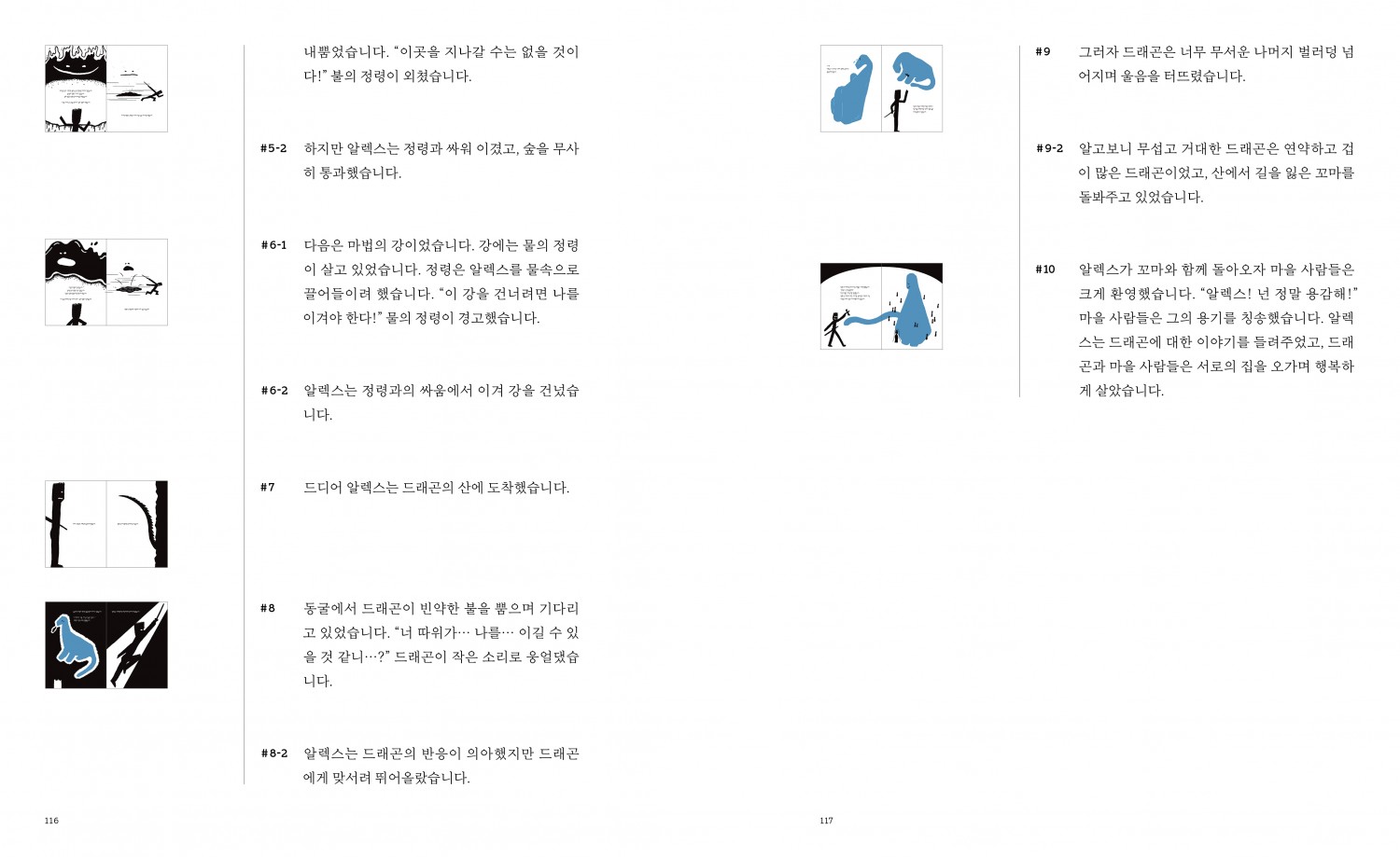 작가가 작품의 핵심을 잘 잡고 있으면 작업을 진행하면서 개선해야 할 점을 발견했을 때 미세한 방향 조정을 통해 최선의 장면 구성과 흐름을 찾아 완성해 나가면서 작품의 밀도를 높일 수 있습니다. 이를 위해서는 무엇보다 그림책의 핵심 메시지를 작가 스스로 명확히 인식하는 것이 중요합니다. 이 메시지는 변하지 않아야 할 중심축이기 때문입니다. 큰 지도 없이 감각에 의존해 지엽적인 조정을 하다 보면 결국 그림책 메시지가 흐려질 수 있습니다. 모든 장면이 핵심 메시지를 위해 긴밀하게 서로 연결되며 주제를 뒷받침하는지 반드시 점검해야 합니다.