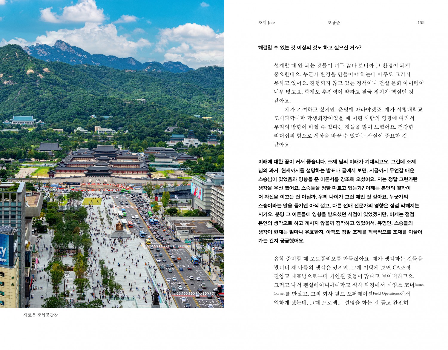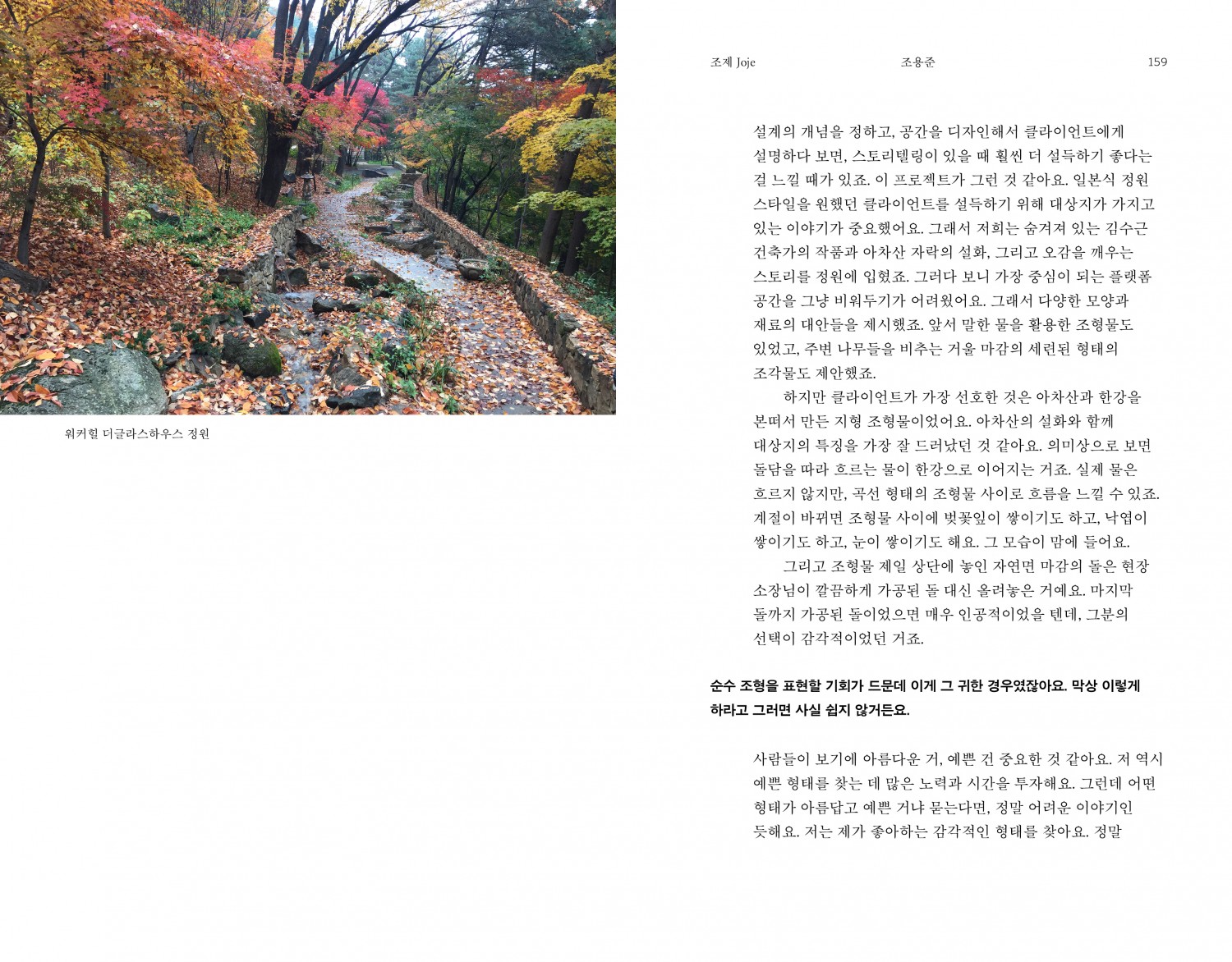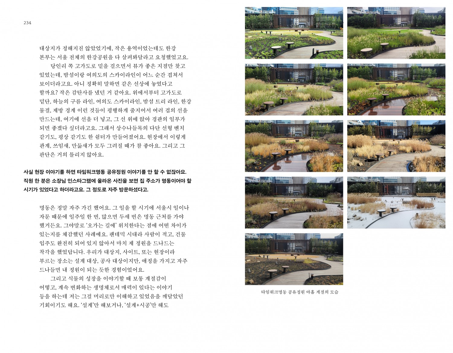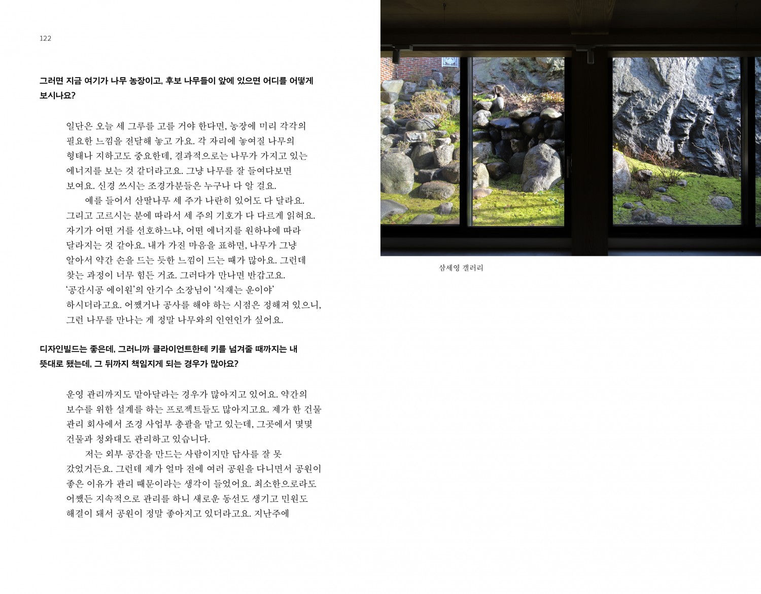 인터뷰한 일곱 팀은 오늘날 한국 조경의 흐름과 방향을 가장 선명하게 보여주는 핵심 주체들이다. ‘얼라이브어스’는 <롯데호텔 제주 특화 설계> <역삼 포스코센터> 등 감각과 논리가 균형을 이루는 도시 풍경을 그린다. ‘안마당더랩’은 <호지 스테이> <어프로치 커피> 등 안정과 긴장이 공존하는 일상 공간을 탐구한다. ‘도감’은 <남해 끽다원> <안성 목적지9> 등 직접 짓는 디자인빌드 방식을 통해 조경의 새로운 미학을 제안한다. <새로운 광화문광장> <국립새만금수목원> 등을 설계한 ‘조제’는 공공과 예술의 경계를 넘나드는 작업을 선보인다. ‘제이더블유엘’은 <성수동 우란문화재단> <장충동 호텔신라 에르메스정원> 등 절제된 미감과 정제된 구성으로 공간의 품격을 만든다. ‘랩디에이치’는 조경의 사회적 역할에 주목하며 <타임워크명동 공유정원> <한강변 보행네트워크> 등 공공과 민간을 아우르는 프로젝트를 수행한다. <국립현대미술관 과천관 조경 리노베이션> <현대자동차 강남사옥 옥상정원> 등을 작업한 ‘오픈니스’는 한국적 정서와 현대적 감각을 조화시켜 일상 풍경을 새롭게 디자인한다.