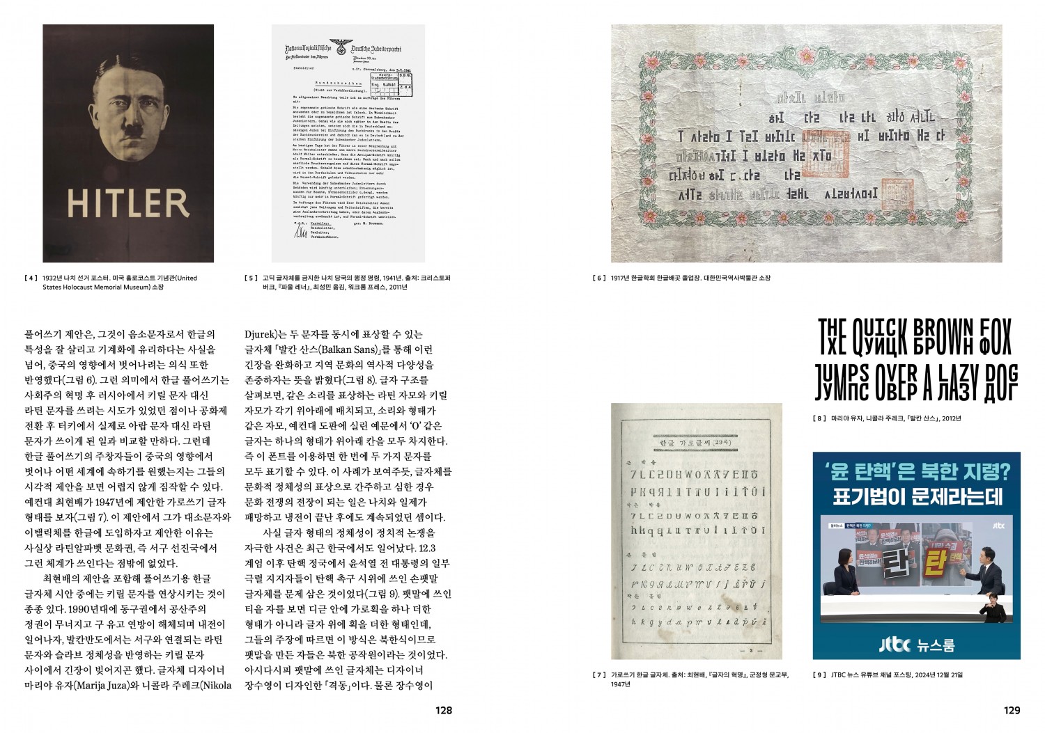 특집은 프로파간다와 브랜딩이라는 굵직한 두 주제로 묶었다. ‘특집 1 타이포그래피와 프로파간다’에서 최성민의 「“진심을 전하고자 제 손글씨체로 인사를 드리오니”」는 구성주의 타이포그래피에서 손글씨까지, 역사 속 정치와 타이포그래피의 관계를 되짚었다. 특히 지난 내란 정국과 대선에서의 몇몇 사례를 조명해 동시대 정치에 녹아 있는 글자의 역할을 분석한다. 심우진의 「《시대 정신》 프로젝트 되돌아보기, 우린 어디로 흘러가는가」는 일상의실천과의 인터뷰 형식으로 기록되었다. 일상의실천이 기획한 《시대 정신》 프로젝트를 주제로 이번 프로젝트의 특징을 여섯 가지로 추려 살폈다. ‘특집 2 브랜딩 전략과 타이포그래피’에서 전우성의 「브랜드를 인식하게 하는 또 하나의 요소, 타이포그래피」는 브랜드를 인식하게 하고 성격을 부여하며 기억에 각인시키는 강력한 도구로서 타이포그래피가 지닌 가능성을 고찰한다. 이어서 「수집: 브랜딩과 타이포그래피 2025」에서는 디자인 스튜디오에서 에이전시에 이르는 다양한 규모의 디자인 집단을 대상으로 설문을 진행했다. 이를 통해 타이포그래피가 실제 브랜딩 안에서 어떤 방식으로 선택되고 운용되는지를 분석할 수 있다. 허민재와 박재형은 「호텔 브랜드 디자인에서 마스터 브랜드의 보증과 로고타입 그리고 타이포그래피」에서 글로벌 호텔 체인 3사 메리어트, 힐튼, 하얏트의 로고타입과 타이포그래피 사례를 분석해 브랜드와 타이포그래피가 유기적으로 작동하며 일관된 경험을 형성하는 과정을 해부한다.