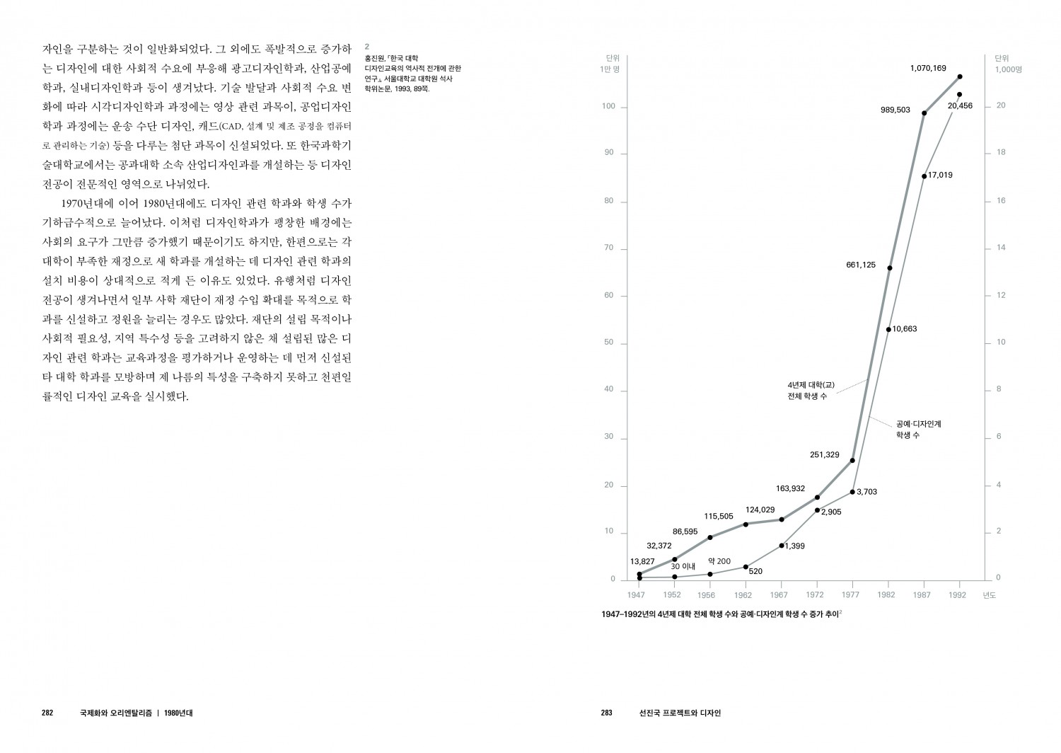 『한국 현대 디자인사』는 이러한 변화를 통해 ‘한국적 정체성’이 자생적 문화의 결과가 아니라, 시대마다 달리 작동한 정치적 기획의 산물이었음을 보여준다. 1970년대 민족주의가 내부 결속을 위한 시각 전략이었다면, 1980년대 한국성은 세계 시장을 향한 시각적 브랜딩이었다. 두 시기의 디자인 모두 ‘한국다움’을 말하지만, 그 언어는 철저히 권력의 필요에 따라 만들어지고 재가공된 것이다.
