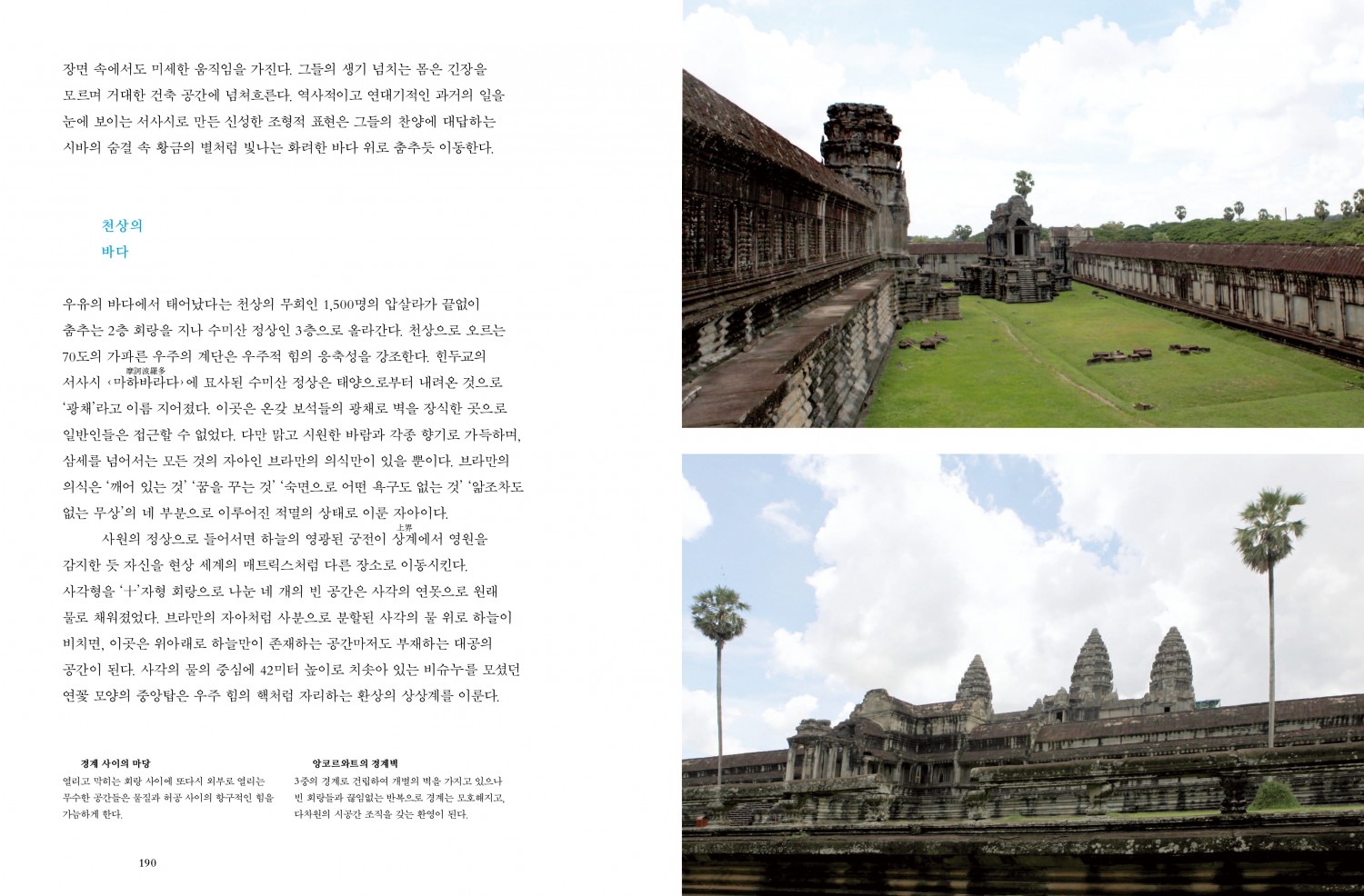 크메르인의 수도 앙코르는 정글 속에 묻혀 있던 크메르 제국의 찬란하고 매혹적인 영화를 신과의 기억으로 되살아나게 하는 흔적들로 가득하다. 도처에 돌로 지어진 짙은 회색의 사원들은 세월의 무게를 못 이기고 균형을 잃은 벽체들로 인해 춤추는 듯한 유연함을 지니고 있다.